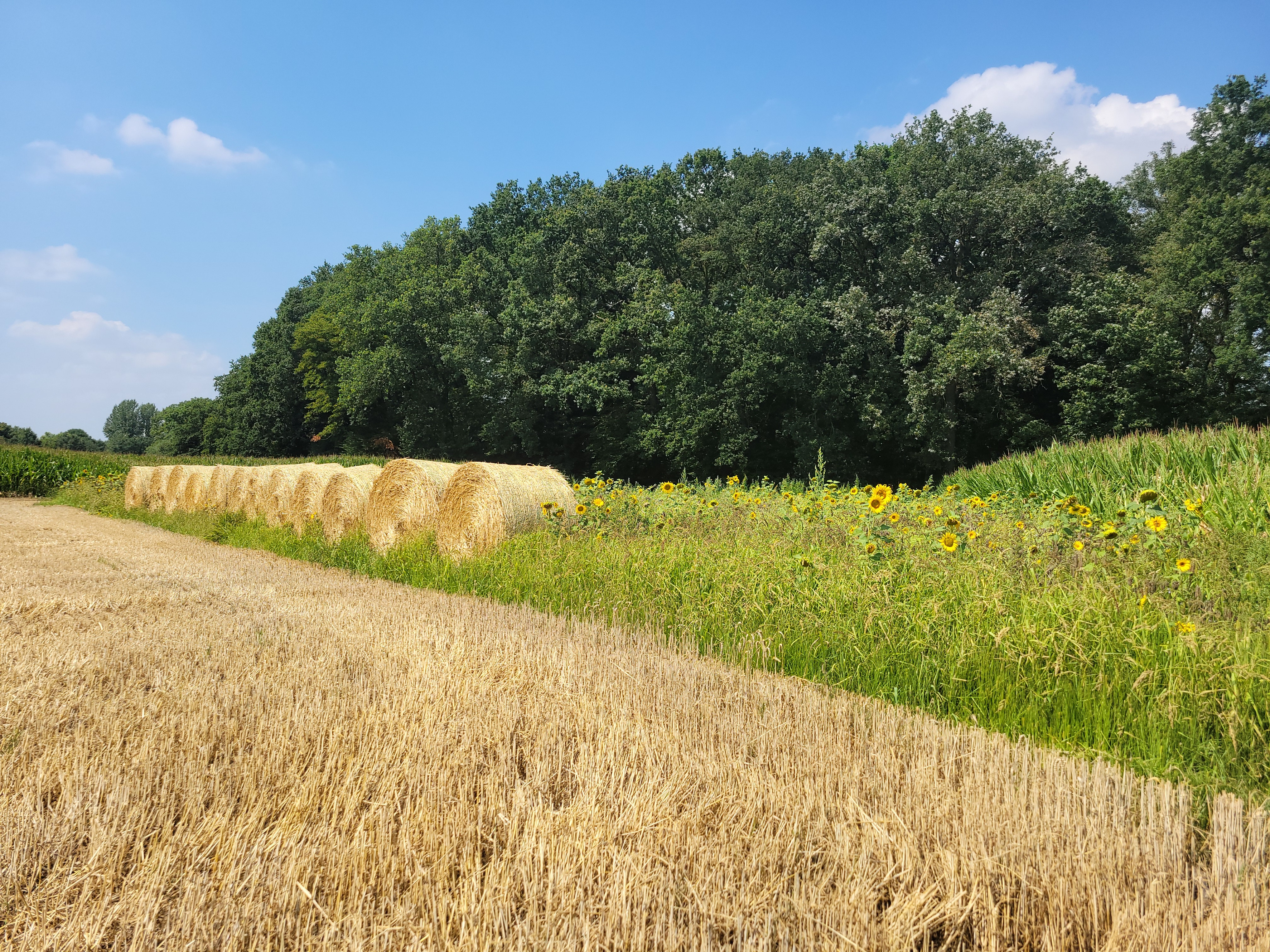 Zu unserem Betrieb gehören etwa 50 ha landwirtschaftliche Nutzfläche, auf denen wir Gras, Mais und Getreide wechselnd anbauen. Diese Pflanzen nutzen wir als Silage oder Heu zur Fütterung oder als Stroh zum Einstreuen.